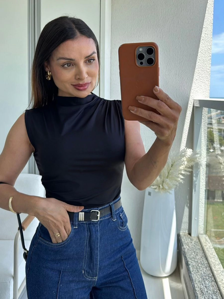 Blusa regata com elástico franzido na lateral e em um dos ombros.