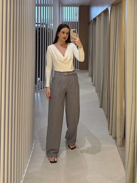 Calça pantalona de alfaiataria com pregas, possui botão invisível, bolso tipo faca e passante para cinto.