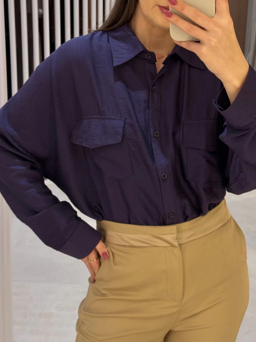 Camisa ampla com dois bolsos na altura do busto.
